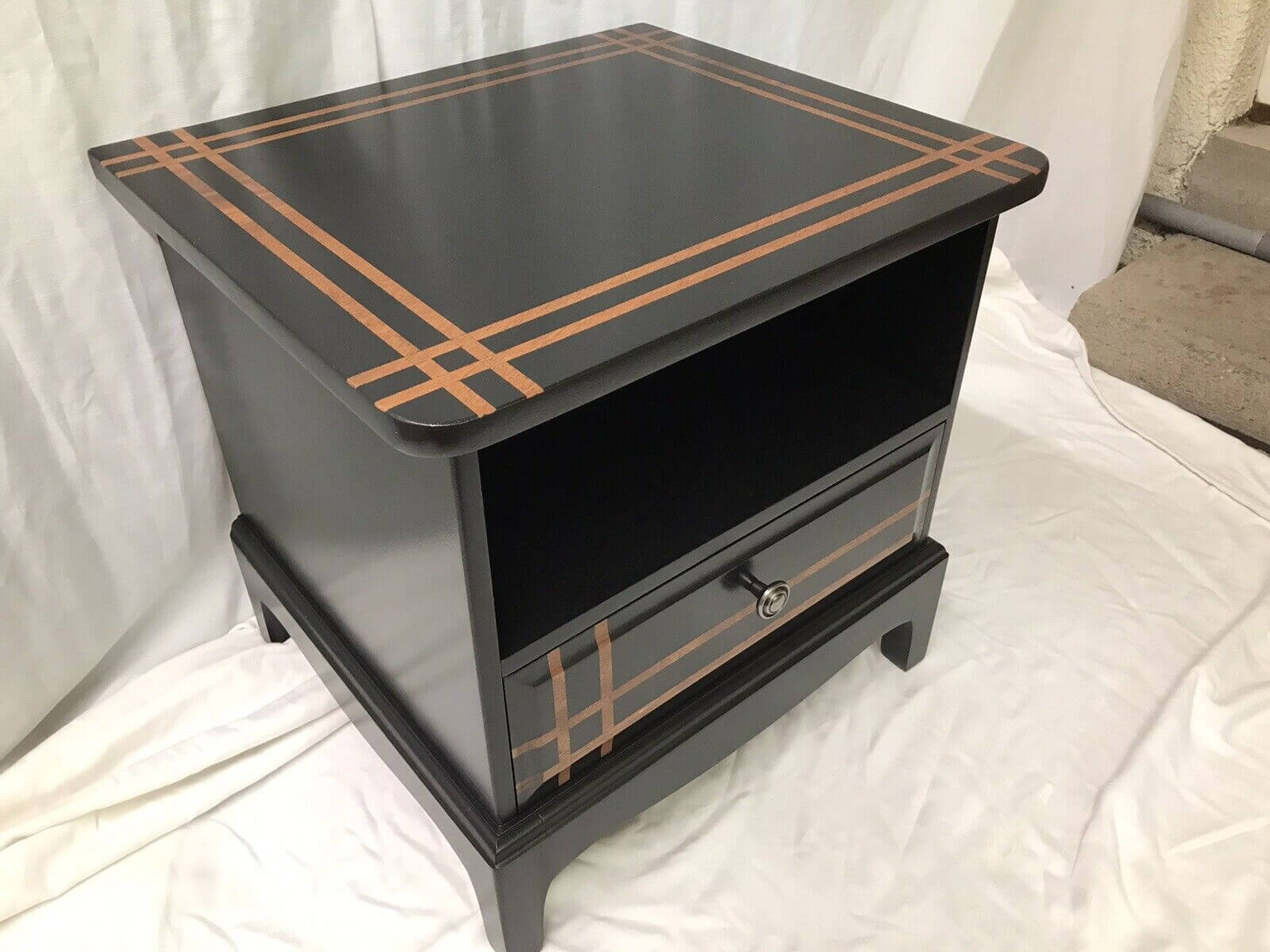 The table has undergone a full sanding to remove the existing lacquer prior to a primer undercoat followed by two two coats of black satin.