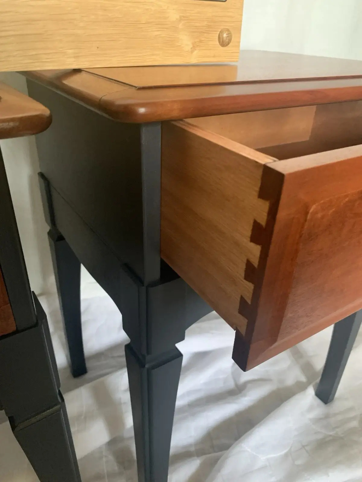 These bedsides have been fully sanded to key the primer undercoat prior to two coats of satin paint. A wax oil treatment has been applied to protect the African cherry wood whilst providing a lasting sheen.