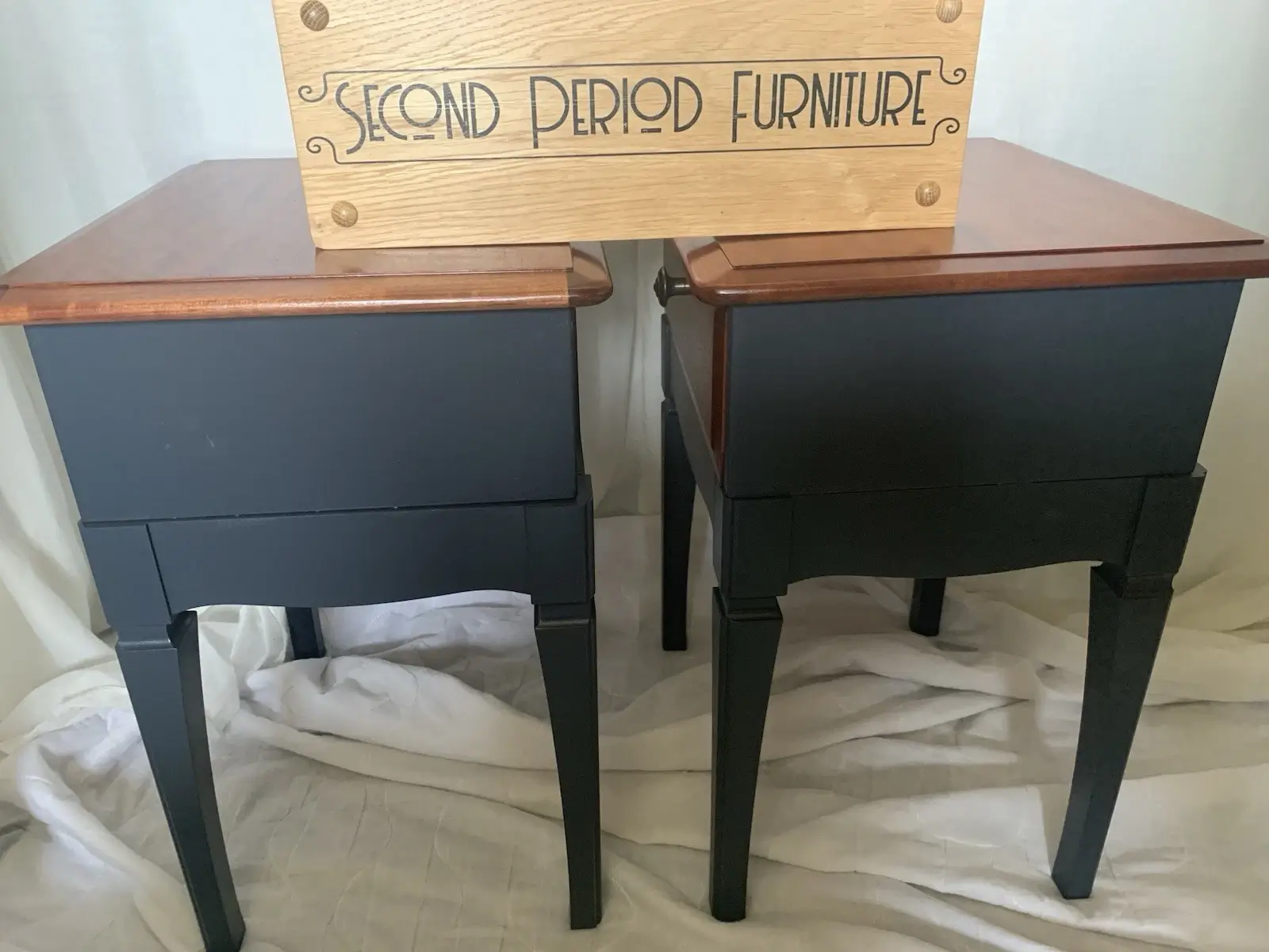 SECOND PERIOD FURNITURE Presents these beautifully refurbished Stag bedside tables finished in a Fired Earth satin paint, colour, Top Hat.