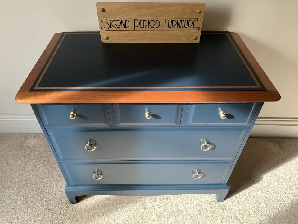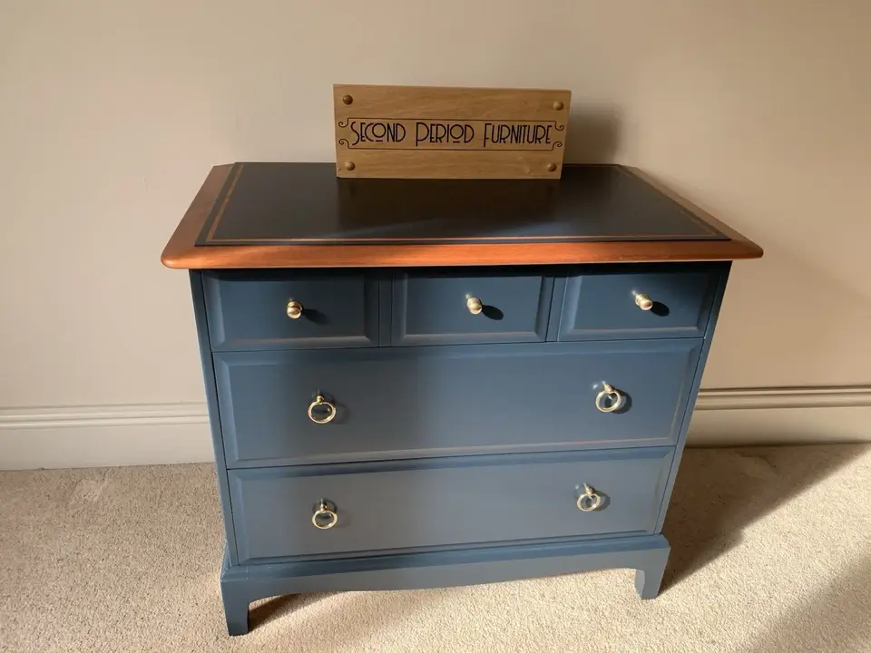 SECOND PERIOD FURNITURE presents this Stag Minstrel five drawer chest fully refurbished and painted in the colour French Navy.