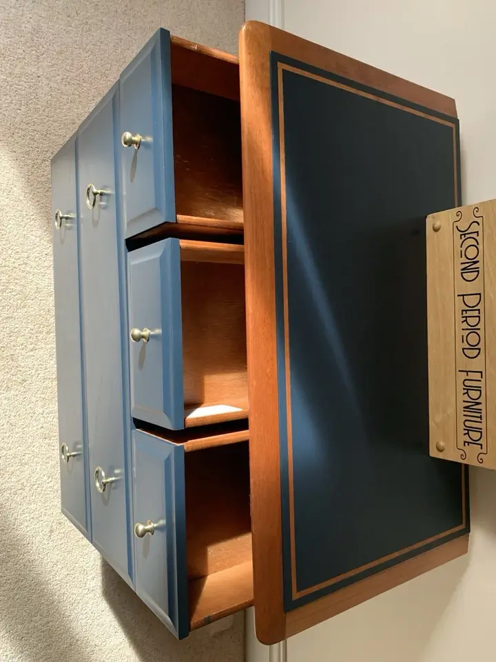 This chest has been fully sanded prior to a primer undercoat followed by two coats of satin paint. A finishing wax has been applied to add durability and protection.