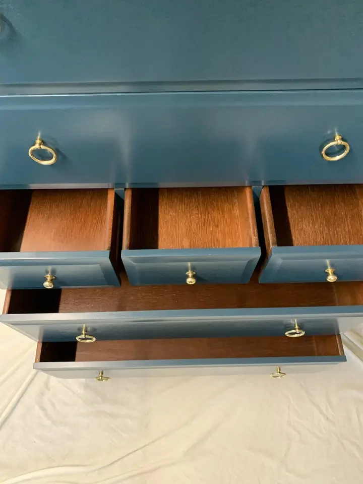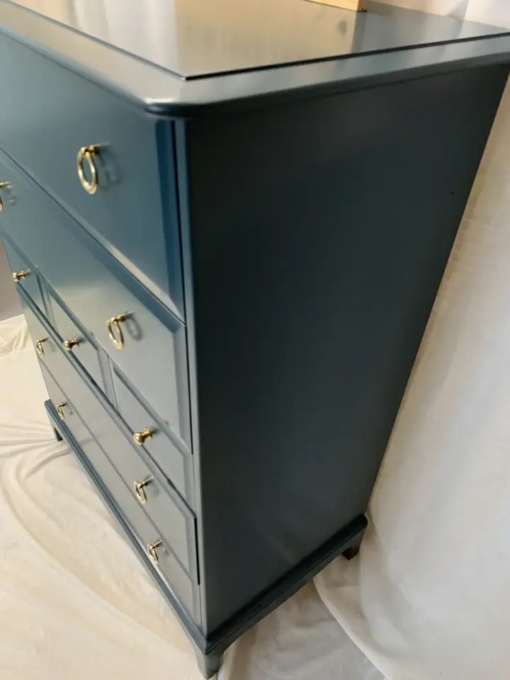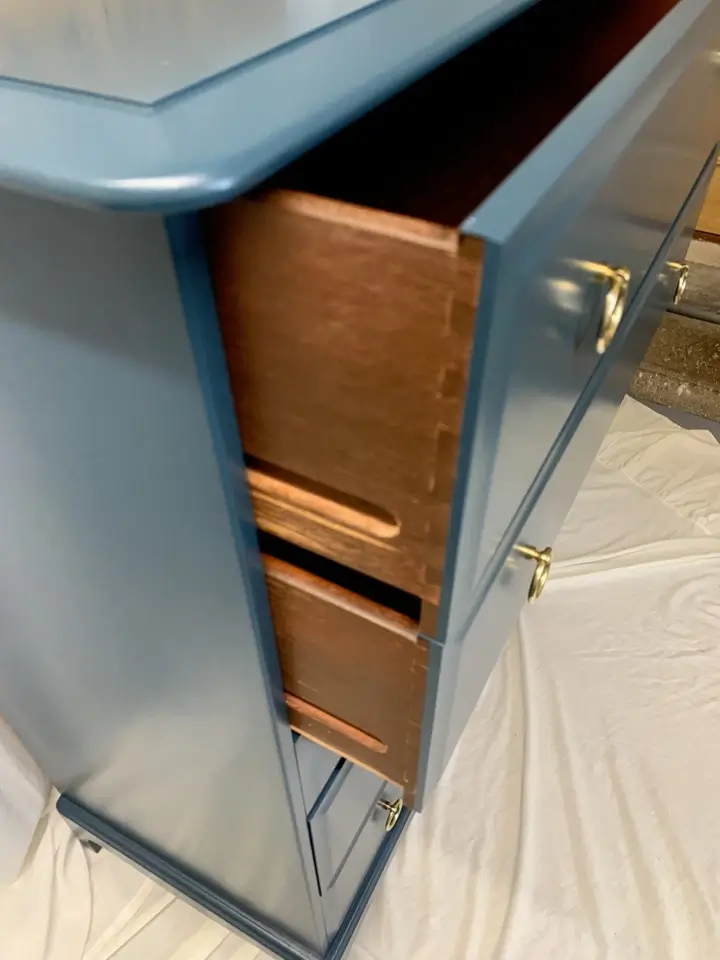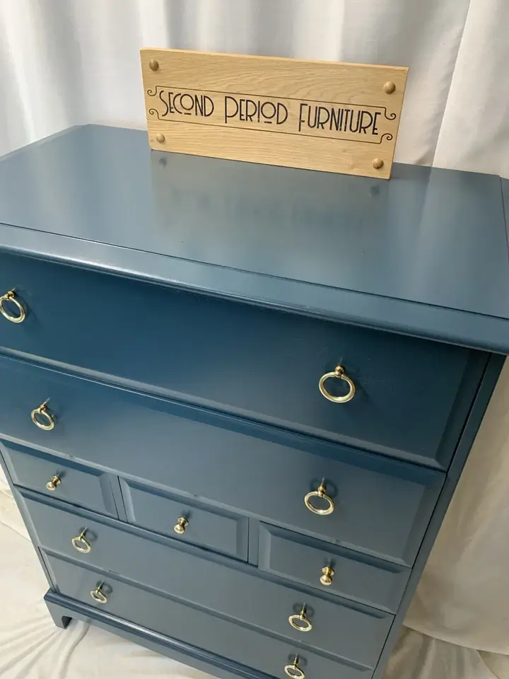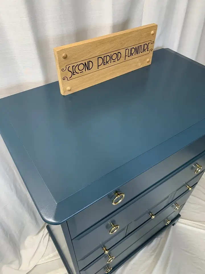 This lovely chest of drawers has been fully sanded prior to a primer/undercoat followed by two coats of satin paint, Haigh Blue.